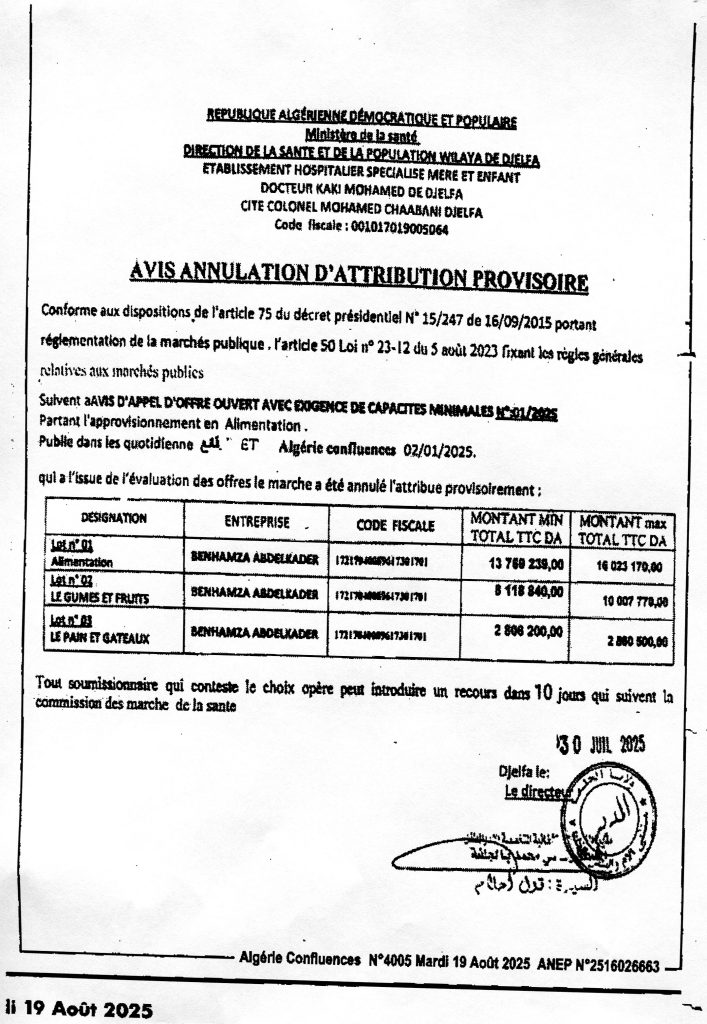 اعلان عن الغاء منح مؤقت لطلب العروض لفائدة مديرية الصحة و السكان