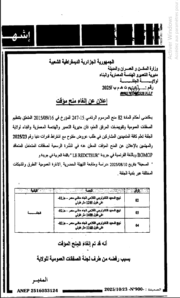 آخر الإعلانات:اعلان عن استشارة رقم 10 /2026 للمؤسسة العمومية الاستشفائية الام والطفل بالجلفةاعلان عن الغاء استشارة رقم 09 /2026 للمؤسسة العمومية الاستشفائية الام والطفل بالجلفةاعلان عن المنح المؤقت للاستشارة رقم 06 / 2026 لمديرية الحماية المدنية لولاية الجلفةاعلان عن المنح المؤقت رقم 05/04/03 / 2026 لمديرية الحماية المدنية لولاية الجلفةاعلان عن الغاء استشارة رقم 59 /2026 لبلدية عين وسارةاعلان عن استشارات رقم 58/60 /2026 لبلدية عين وسارةاعلان عن التأهيل في المسابقة الوطنية المحدودة في الهندسة المعمارية لمديرية التعمير لولاية الجلفةاعلان عن المنح المؤقت لطلب العروض رقم 06 /2026 لبلدية الجلفةاعلان عن منح مؤقت رقم 29/30/31/34 /2026 لمديرية التجهيزات العمومية لولاية الجلفةاعلان عن طلب عروض رقم 63 /2026 لمديرية التجهيزات العمومية لولاية الجلفةاعلان عن طلب عروض رقم 06/05 /2026 لبلدية دار الشيوخاعلان عن المنح المؤقت لبلدية الشارفاعذار ثاني من مديرية السكن لولاية الجلفة موجه لمؤسسة برادعي محمداعذار ثاني من مديرية التعمير لولاية الجلفة موجه لمؤسسة ذياب سعداعلان عن المنح المؤقت لطلب العروض لمديرية التجهيزات العمومية لولاية الجلفةاعلان عن التأهيل الاولي للمسابقة الوطنية في الهندسة المعمارية لديوان الترقيةوالتسيير العقاري لولاية الجلفةاعلان عن عدم جدوى طلب العروض لمديرية الشباب والرياضة لولاية الجلفةاعلان عن تصحيح المنح المؤقت رقم 01 /2026 للمؤسسة العمومية الاستشفائية بحاسي بحبحاعلان عن المنح المؤقت لبلدية دار الشيوخاعلان عن الغاء استشارات رقم 16/15/14/13 /2026 لمديرية التربية لولاية الجلفةاعلان عن الغاء استشارات رقم 12/11/10/09 /2026 لمديرية التربية لولاية الجلفةاعلان عن الغاء استشارات رقم 08/07/06/05 /2026 لمديرية التربية لولاية الجلفةاعلان عن الغاء استشارات رقم 04/03/02/01 /2026 لمديرية التربية لولاية الجلفةاعلان عن استشارة رقم 11 /2026 لمديرية وحدة بريد الجزائر لولاية الجلفةاعلان عن المنح المؤقت للاستشارة رقم 12 /2026 لديوان الترقيةوالتسيير العقاري لولاية الجلفةاعذار رقم 02 من طرف مديرية السكن لولاية الجلفة موجه لمؤسسة برادعي محمداعذار اول من طرف مديرية الثقافة لولاية الجلفة موجه لتجمع الازدهاراعلان عن المنح المؤقت لطلب العروض رقم 06/ 2026 لبلدية الجلفةاعلان عن الغاء المنح المؤقت لطلب العروض رقم 05/2026 لبلدية سد رحالاعلان عن عدم جدوى طلب العروض لمديرية الشباب والرياضة لولايةالجلفةاعلان عن المنح المؤقت لمديرية الشباب والرياضة لولايةالجلفةاعلان عن المنح المؤقت لطلب العروض رقم 38/ 2026 لمديرية التجهيزات العمومية لولايةالجلفةاعلان عن الغاء المنح المؤقت لطلب العروض رقم 19/2026 لمديرية التعمير والهندسة المعمارية والبناء لولايةالجلفةاعلان عن طلب عروض رقم 05/ 2026 لبلدية الجلفةاعلان عن طلب عروض رقم 03/ 2026 لمديرية الشباب والرياضة لولاية الجلفةاعلان عن طلب عروض رقم 13/12/ 2026 لمديرية التعمير والهندسة المعمارية والبناء لولاية الجلفةاعلان عن استشارة رقم 10 /2026 لمديرية وحدة بريد الجزائر لولاية الجلفةاعلان عن عدم جدوى الاستشارة رقم 11 /2026 لديوان الترقيةوالتسيير العقاري لولاية الجلفةاعلان عن إستشارات رقم 65/55/54 /2026 لبلدية عين وسارةاعذار رقم 01 من مصالح بلدية عين وسارة موجه لمؤسسة برادعي محمداعلان عن المنح المؤقت لطلب العروض رقم 17/2026 للمؤسسة العمومية الاستشفائية عين وسارةاعلان عن تصحيح المنح المؤقت لطلب العروض رقم 02/2026 لمديرية السكن لولاية الجلفةاعلان عن المنح المؤقت لطلبات العروض رقم 03/01 /2026 لمديرية السكن لولاية الجلفةاعلان عن الغاء المنح المؤقت لطلب العروض رقم 19/2026 لمديرية التعمير والهندسة المعمارية والبناء لولاية الجلفةاعلان عن طلب عروض رقم 08 /2026 لبلدية سد رحالاعلان عن طلب عروض رقم 13 /2026 لمديرية التعمير والهندسة المعمارية والبناء لولاية الجلفةاعلان عن المنح المؤقت للاستشارة رقم 09 /2026 لبلدية عين افقهاعلان عن المنح المؤقت لبلدية مسعدمنح 