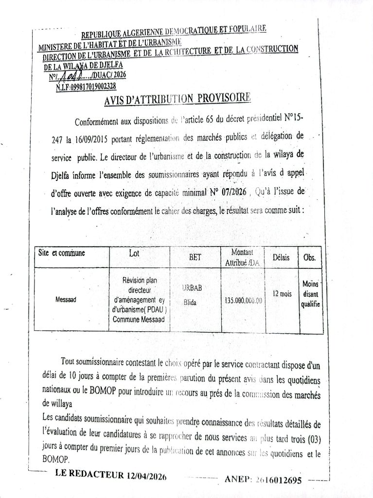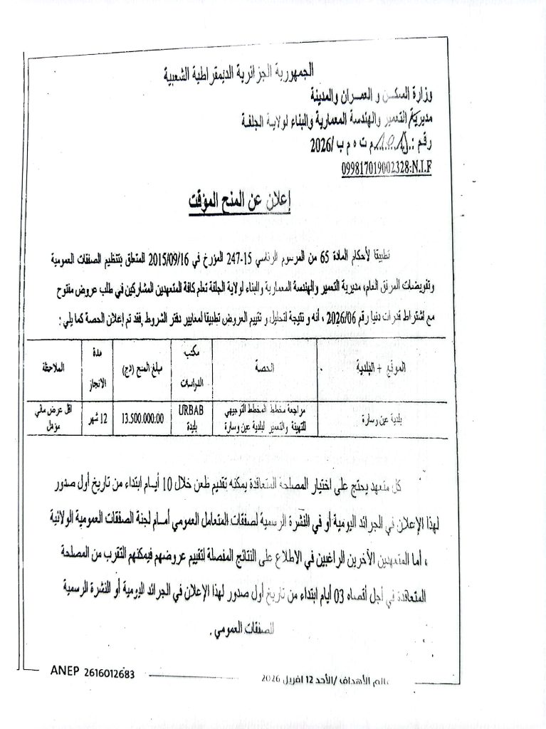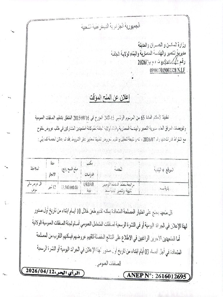 اعلان عن المنح المؤقت لطلبات العروض رقم 07/06/2026 لمديرية التعمير والهندسة المعمارية والبناء لولاية الجلفة