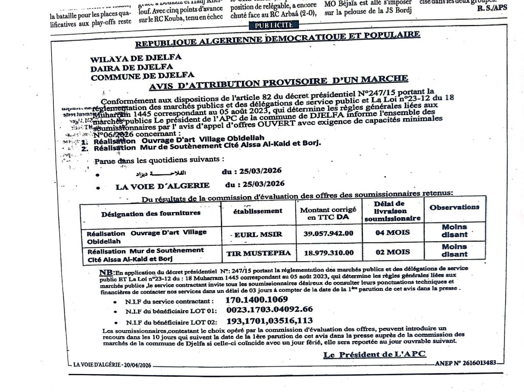 اعلان عن المنح المؤقت لطلب العروض رقم 06 /2026 لبلدية الجلفة