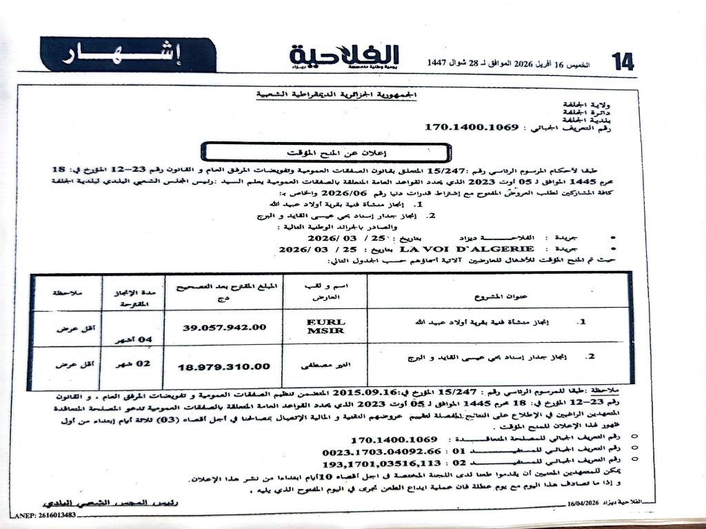 اعلان عن المنح المؤقت لطلب العروض رقم 06/ 2026 لبلدية الجلفة