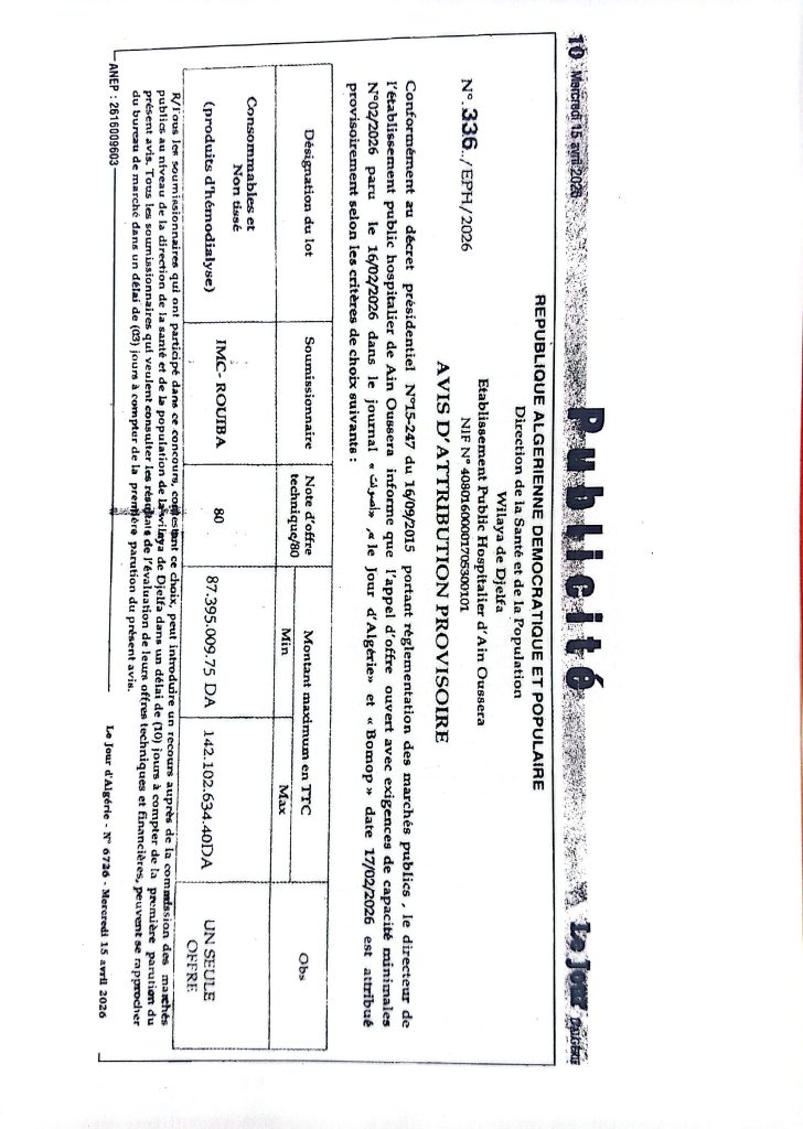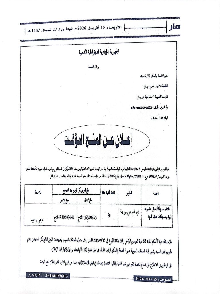 اعلان عن المنح المؤقت لطلب العروض رقم 17/2026 للمؤسسة العمومية الاستشفائية عين وسارة
