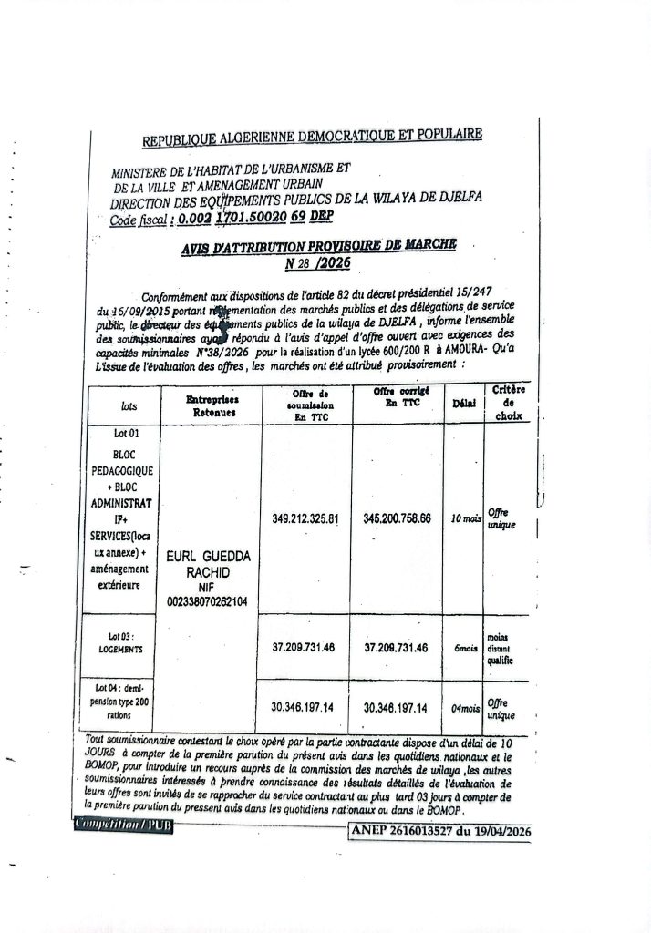 اعلان عن المنح المؤقت لطلب العروض لمديرية التجهيزات العمومية لولاية الجلفة
