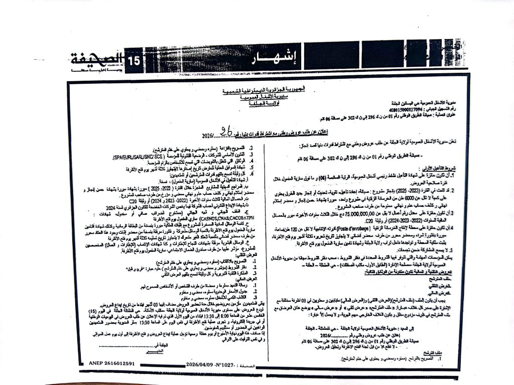2. اعلان عن طلبات عروض رقم 26/25/24 /2026 لمديرية الاشعال العمومية لولاية الجلفة