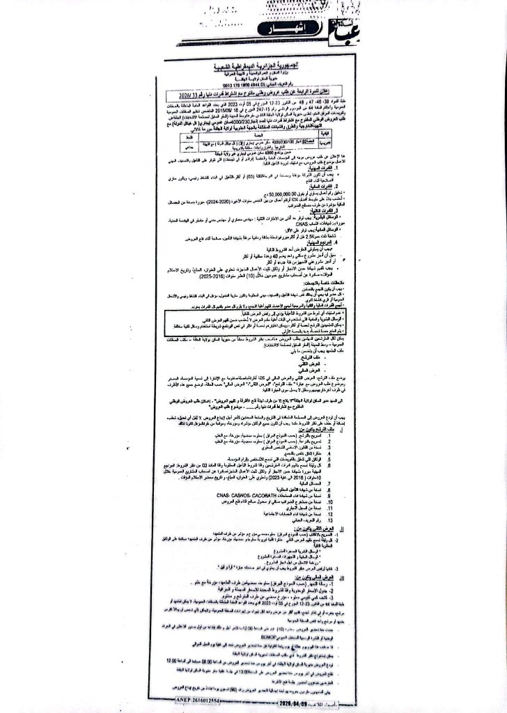 آخر الإعلانات:اعلان عن المنح المؤقت للاستشارة رقم 12 /2026 لديوان الترقيةوالتسيير العقاري لولاية الجلفةاعذار رقم 02 من طرف مديرية السكن لولاية الجلفة موجه لمؤسسة برادعي محمداعذار اول من طرف مديرية الثقافة لولاية الجلفة موجه لتجمع الازدهاراعلان عن المنح المؤقت لطلب العروض رقم 06/ 2026 لبلدية الجلفةاعلان عن الغاء المنح المؤقت لطلب العروض رقم 05/2026 لبلدية سد رحالاعلان عن عدم جدوى طلب العروض لمديرية الشباب والرياضة لولايةالجلفةاعلان عن المنح المؤقت لمديرية الشباب والرياضة لولايةالجلفةاعلان عن المنح المؤقت لطلب العروض رقم 38/ 2026 لمديرية التجهيزات العمومية لولايةالجلفةاعلان عن الغاء المنح المؤقت لطلب العروض رقم 19/2026 لمديرية التعمير والهندسة المعمارية والبناء لولايةالجلفةاعلان عن طلب عروض رقم 05/ 2026 لبلدية الجلفةاعلان عن طلب عروض رقم 03/ 2026 لمديرية الشباب والرياضة لولاية الجلفةاعلان عن طلب عروض رقم 13/12/ 2026 لمديرية التعمير والهندسة المعمارية والبناء لولاية الجلفةاعلان عن استشارة رقم 10 /2026 لمديرية وحدة بريد الجزائر لولاية الجلفةاعلان عن عدم جدوى الاستشارة رقم 11 /2026 لديوان الترقيةوالتسيير العقاري لولاية الجلفةاعلان عن إستشارات رقم 65/55/54 /2026 لبلدية عين وسارةاعذار رقم 01 من مصالح بلدية عين وسارة موجه لمؤسسة برادعي محمداعلان عن المنح المؤقت لطلب العروض رقم 17/2026 للمؤسسة العمومية الاستشفائية عين وسارةاعلان عن تصحيح المنح المؤقت لطلب العروض رقم 02/2026 لمديرية السكن لولاية الجلفةاعلان عن المنح المؤقت لطلبات العروض رقم 03/01 /2026 لمديرية السكن لولاية الجلفةاعلان عن الغاء المنح المؤقت لطلب العروض رقم 19/2026 لمديرية التعمير والهندسة المعمارية والبناء لولاية الجلفةاعلان عن طلب عروض رقم 08 /2026 لبلدية سد رحالاعلان عن طلب عروض رقم 13 /2026 لمديرية التعمير والهندسة المعمارية والبناء لولاية الجلفةاعلان عن المنح المؤقت للاستشارة رقم 09 /2026 لبلدية عين افقهاعلان عن المنح المؤقت لبلدية مسعدمنح مؤقت لبلدية عين معبدإعذار رقم 02 من مديرية السكن لولاية الجلفة موجه الى مؤسسة حميدي لخضراعلان عن المنح المؤقت لطلب العروض رقم 01 /2026 للمؤسسة العمومية الاستشفائية بمسعداعلان عن المنح المؤقت لطلب العروض رقم 03 /2026 لمديرية التعمير والهندسة المعمارية لولاية الجلفةاعلان عن الغاء استشارة رقم 10 /2026 لديوان الترقية والتسيير العقاري بالجلفةاعلان عن طلب عروض رقم 09 /2026 لبلدية الجلفةاعلان عن طلب عروض رقم 08 /2026 لبلدية سد رحالاعلان عن طلب عروض رقم 13 /2026 لمديرية التعمير والهندسة المعمارية والبناء لولاية الجلفةاعلان عن استشارة رقم 53 /2026 لبلدية عين وسارةاعلان عن المنح المؤقت لطلب العروض رقم 35 /2026 لبلدية عين وسارةاعلان عن المنح المؤقت لطلب العروض رقم 02 /2026 لبلدية الخميساعلان عن المنح المؤقت لطلب العروض رقم 04/03/2026 لبلدية الزعفراناعلان عن المنح المؤقت لطلب العروض رقم 05 /2026 لبلدية دلدولاعلان عن المنح المؤقت لطلب العروض رقم 03 /2026 لديوان الترقية والتسيير العقاري لولاية الجلفةاعلان عن طلب العروض رقم 002 /2026 لمديرية الحماية المدنية لولاية الجلفةاعلان عن طلب العروض رقم 01 /2026 للوكالة الولائية للتسيير والتنظيم العقاري بالجلفةاعلان عن استشارة رقم 52 /2026 لبلدية عين وسارةاعلان عن المنح المؤقت للاستشارة رقم 13/12 /2026 لبلدية حد الصحارياعلان عن استشارة رقم 14 /2026 لبلدية حد الصحارياعلان عن استشارة رقم 22 /2026 لمديرية السكن لولاية الجلفةاعلان عن المنح المؤقت لطلب العروض رقم 01/ 2026 لبلدية الخميساعلان عن المنح المؤقت لطلب العروض رقم 01/ 2026 لجامعة الجلفةاعلان عن المنح المؤقت لطلب العروض رقم 20/ 2026 لبلدية عين وسارةاعلان عن المنح المؤقت لطلبات العروض رقم 07/06/2026 لمديرية التعمير والهندسة المعمارية والبناء لولاية الجلفةاعلان عن المنح المؤقت لطلب العروض رقم 01/22 /2026 لمديرية الادارة المحلية لولاية الجلفةاعلان عن المنح المؤقت لطلب العروض رقم 01 /2026 لبلدية ز