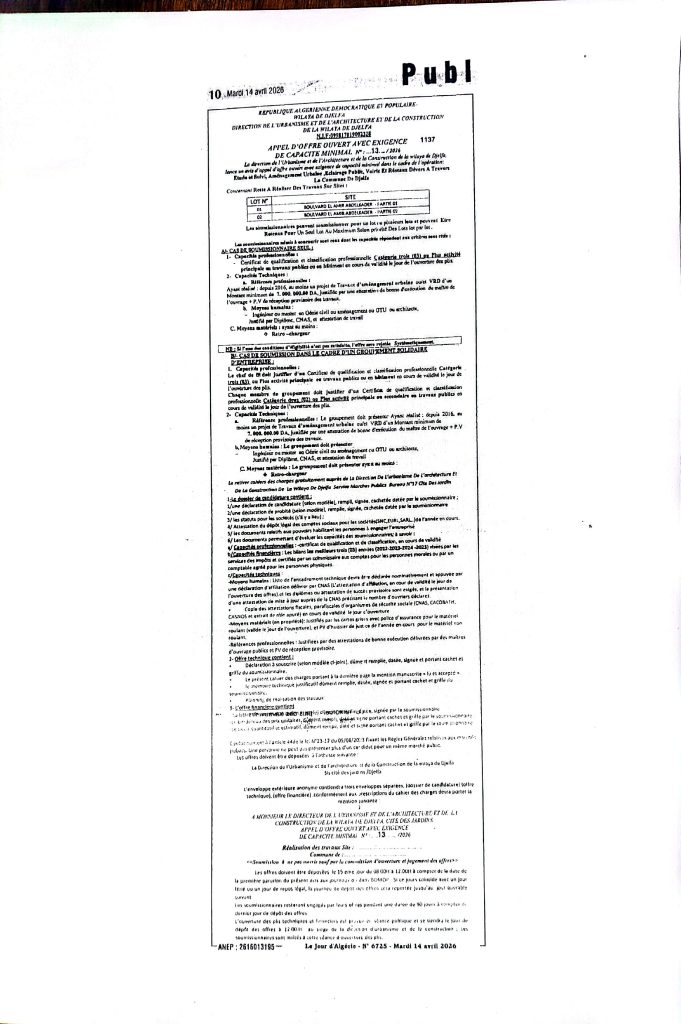 2. اعلان عن طلب عروض رقم 13 /2026 لمديرية التعمير والهندسة المعمارية والبناء لولاية الجلفة