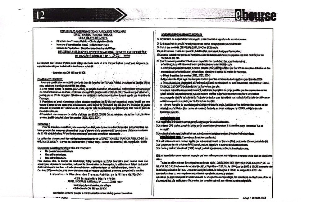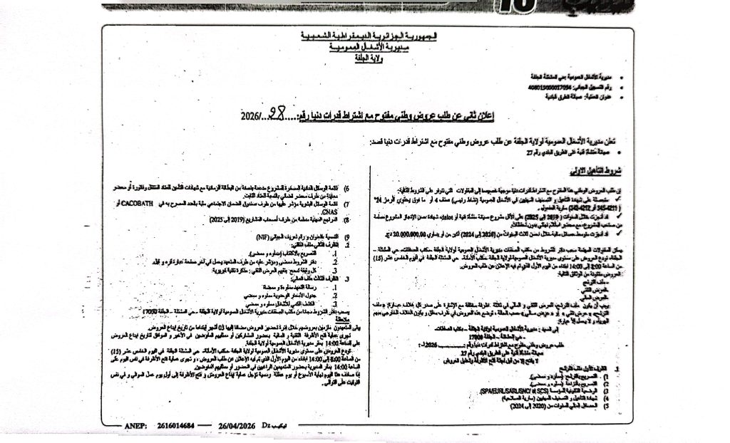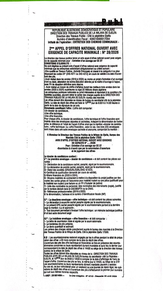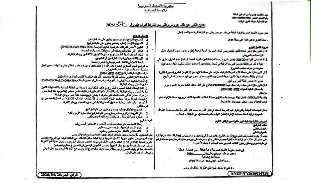 اعلان عن طلب عروض رقم 28/27 /2026 لمديرية الاشغال العمومية لولاية الجلفة