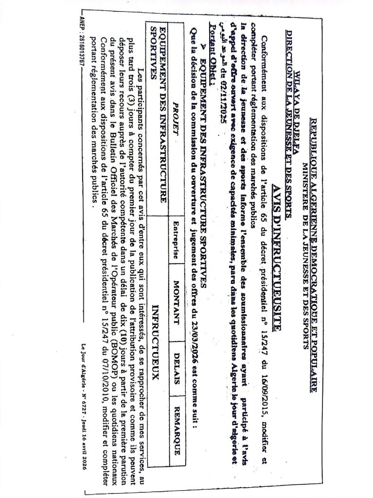 اعلان عن عدم جدوى طلب العروض لمديرية الشباب والرياضة لولايةالجلفة