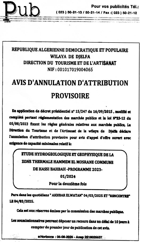 • اعلان عن المنح المؤقت رقم 31/33/34/35/36/37/38/ 39/ 2026 لمديرية التجهيزات العمومية لولاية الجلفة